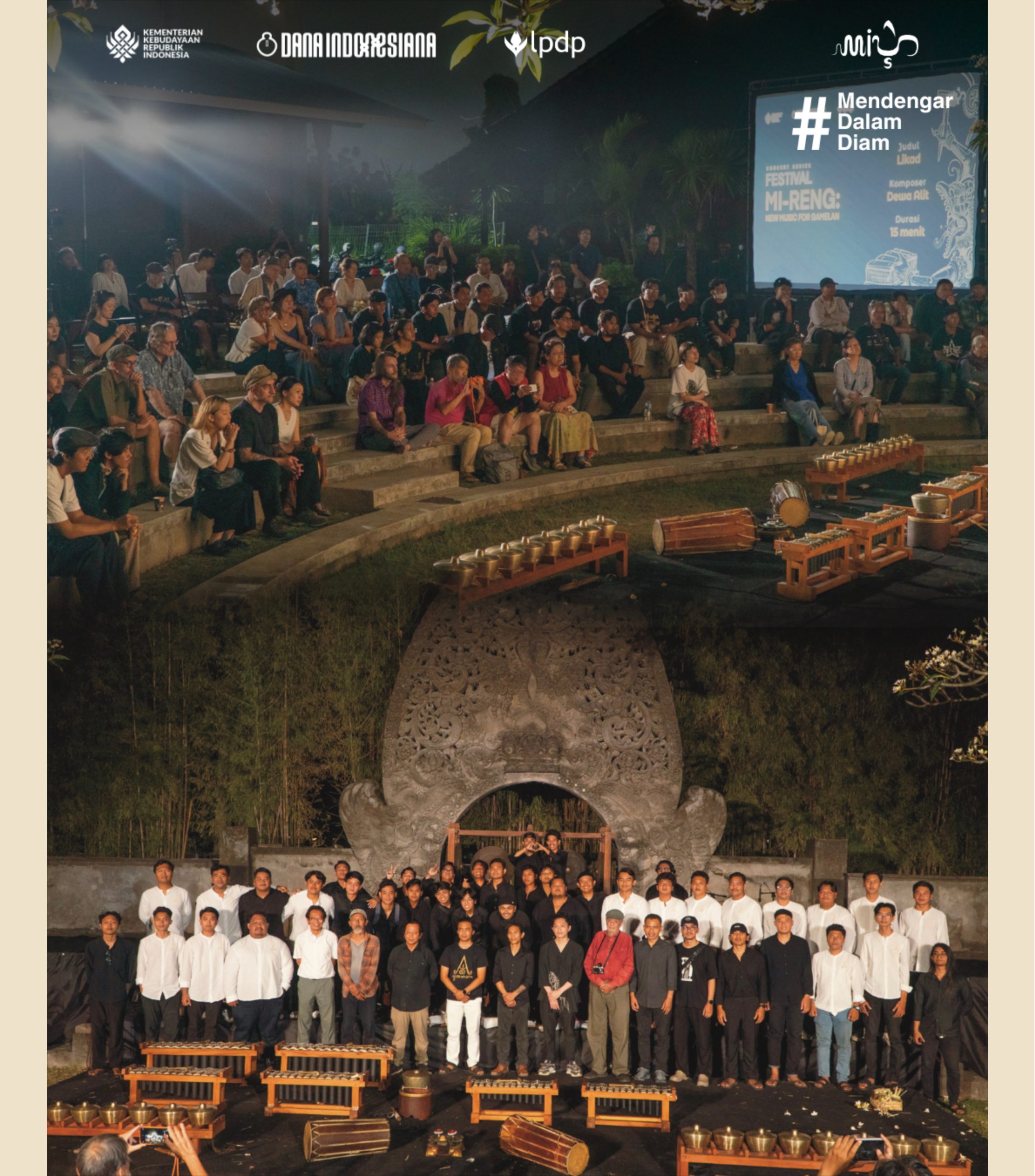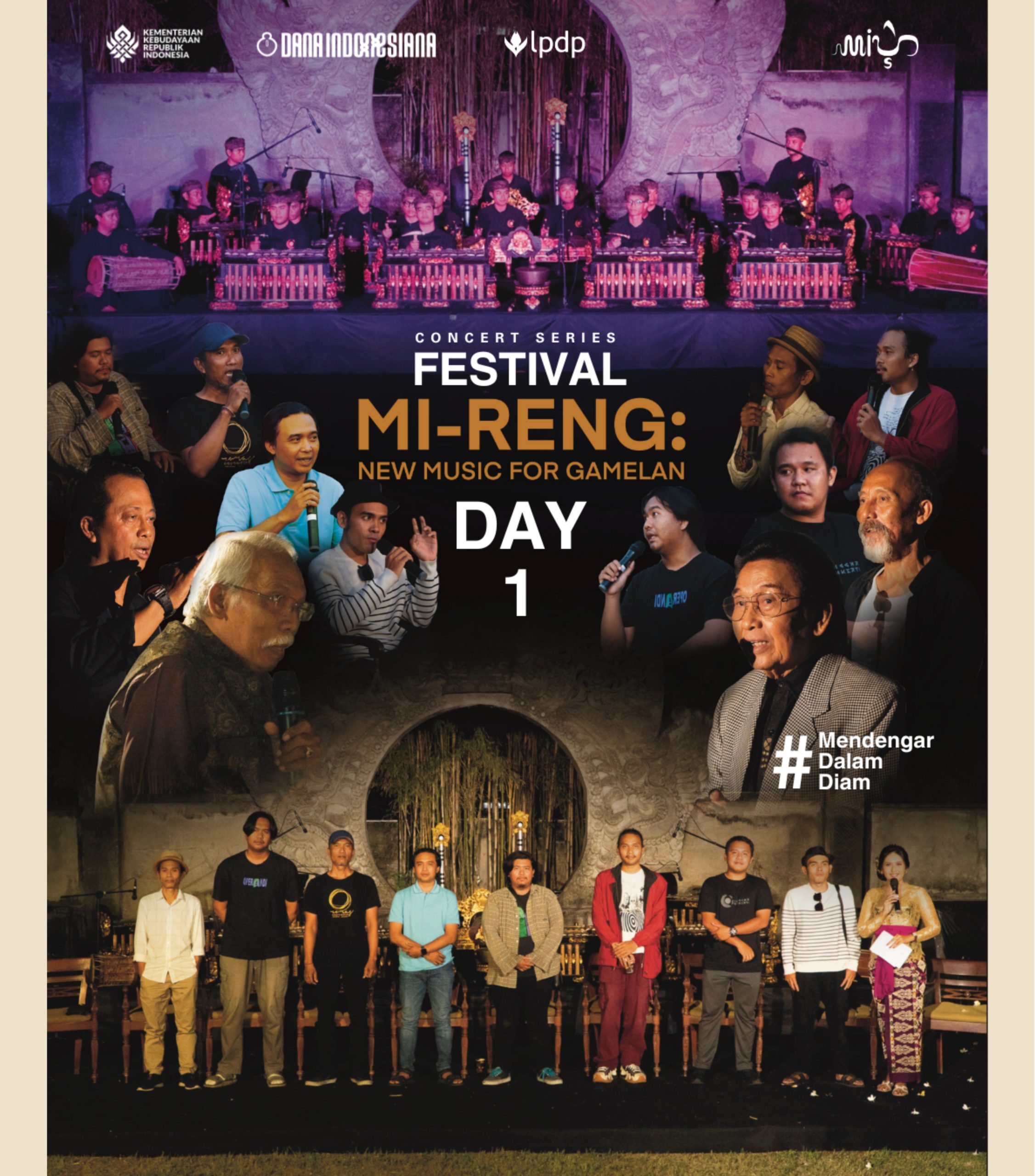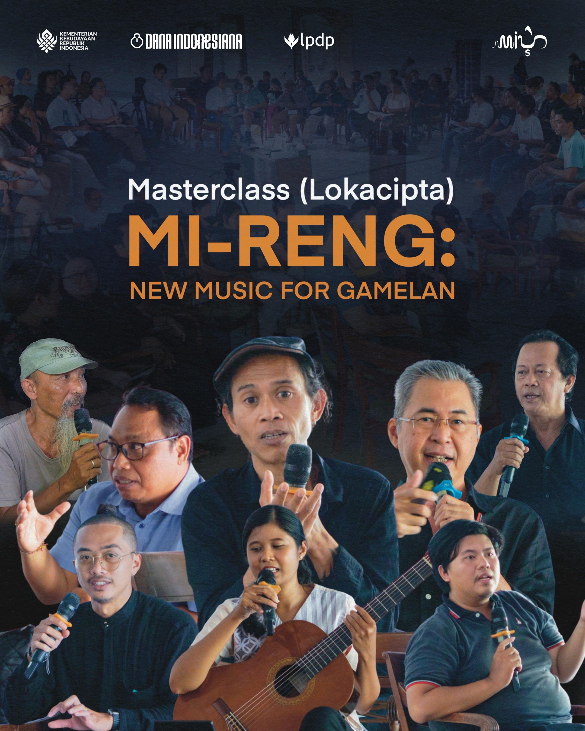 Pertunjukan Mi-Reng: New Music for Gamelan menghadirkan eksplorasi musikal inovatif berbasis gamelan, berpijak pada semangat mendengar (Mi-Reng) secara mendalam. Dalam bahasa Bali dan Jawa, Mi-Reng bermakna “mendengar”. Pada konteks peristiwa cipta yang strategis ini, dipresentasikan dalam satu intensitas mendalam sebagai bagian dari lelaku penghayatan penciptaan.