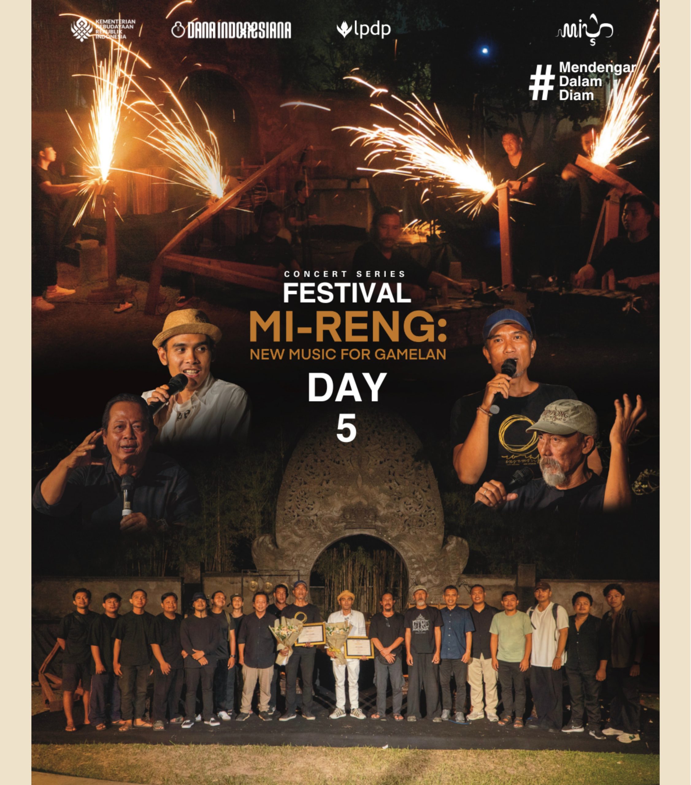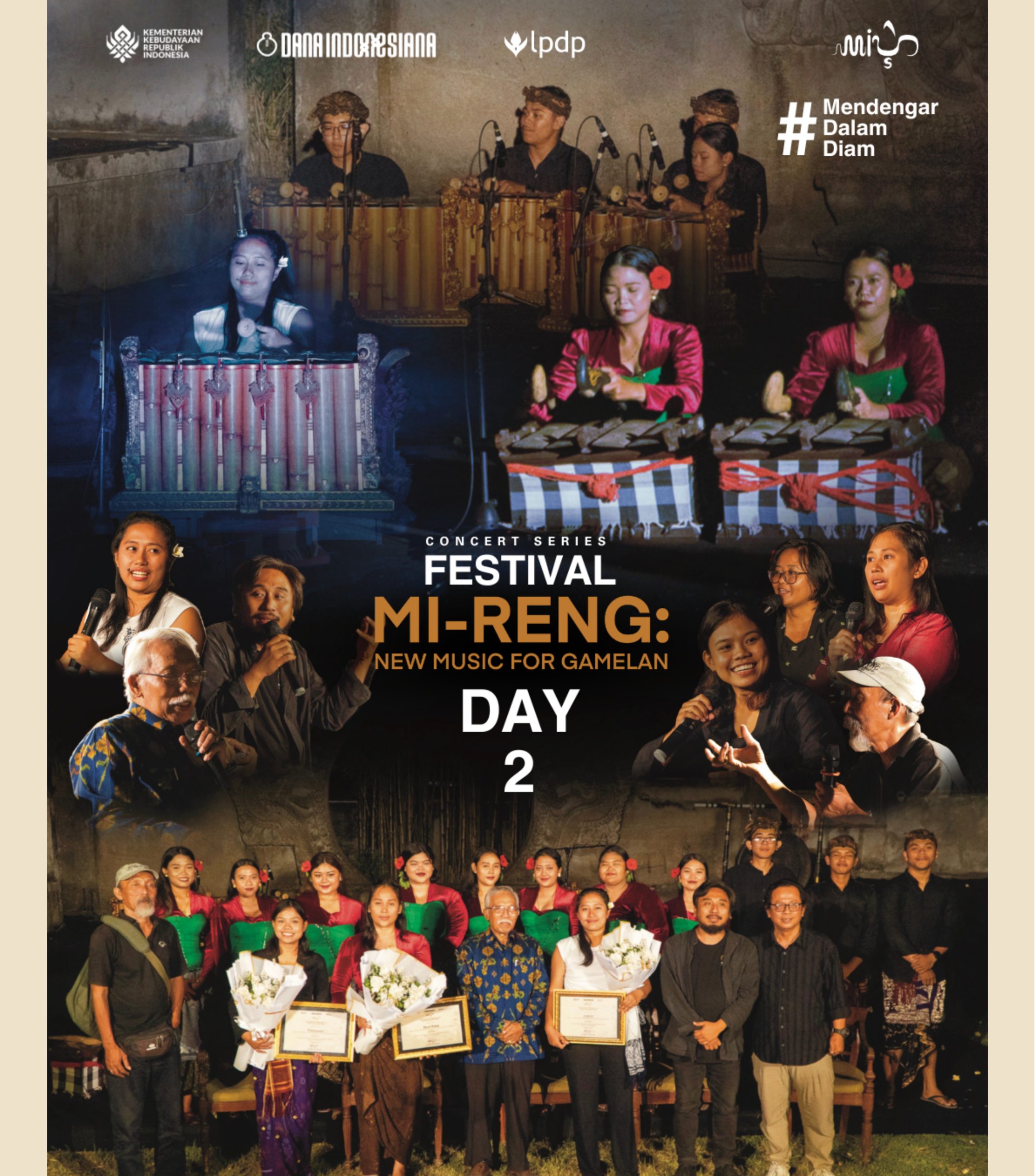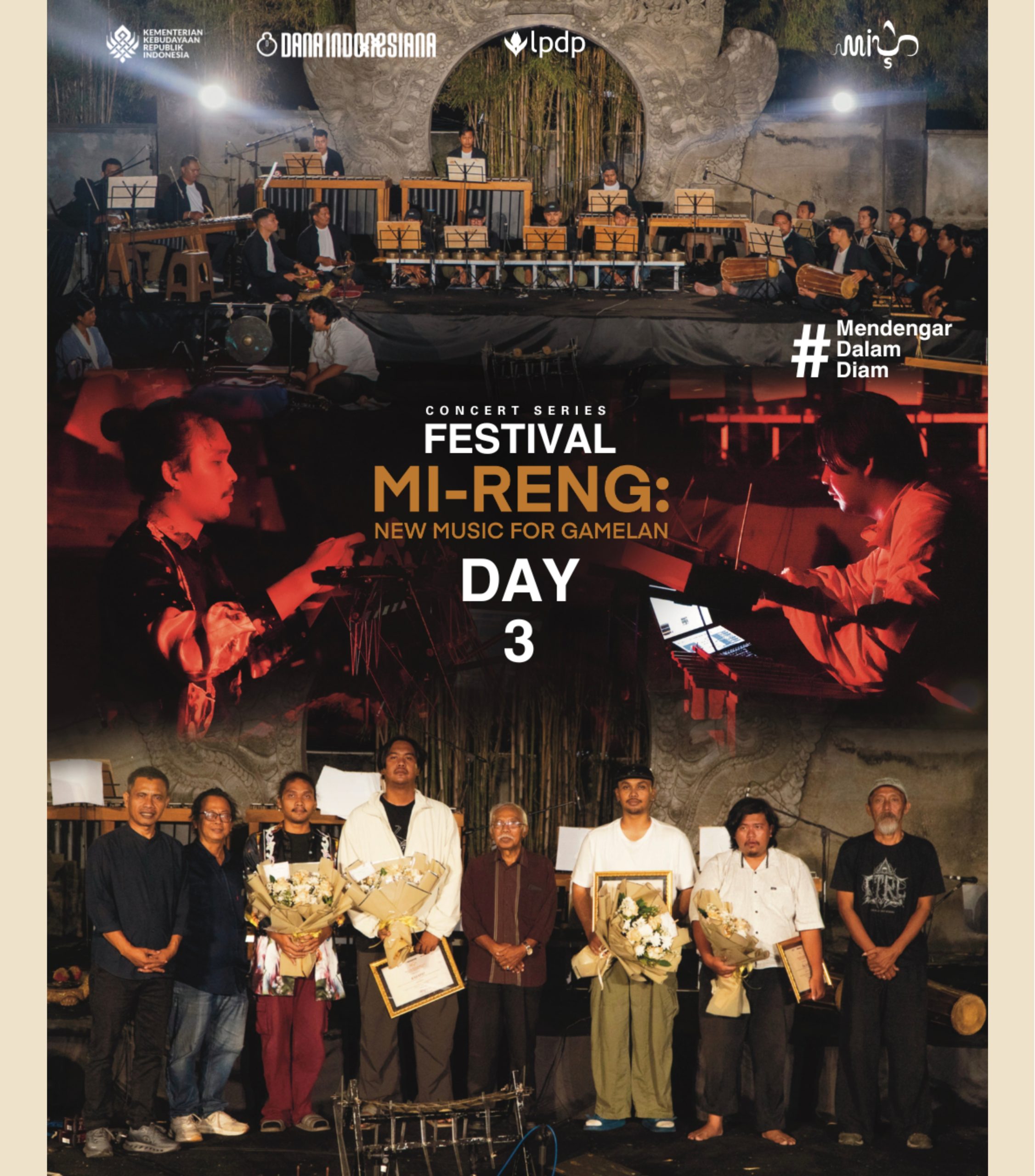 Pertunjukan Mi-Reng: New Music for Gamelan menghadirkan eksplorasi musikal inovatif berbasis gamelan, berpijak pada semangat mendengar (Mi-Reng) secara mendalam. Dalam bahasa Bali dan Jawa, Mi-Reng bermakna “mendengar”. Pada konteks peristiwa cipta yang strategis ini, dipresentasikan dalam satu intensitas mendalam sebagai bagian dari lelaku penghayatan penciptaan.