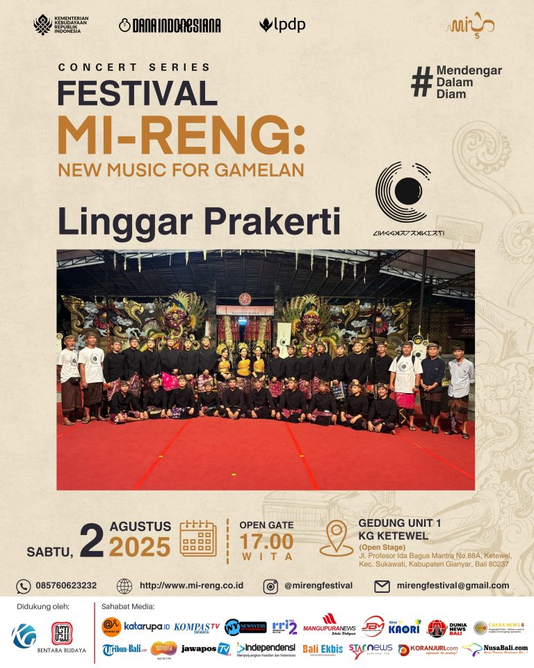 Festival Mi-Reng kembali hadir dengan seri konser musik baru untuk gamelan dimana pada hari ke-1 ini bertajuk “Linggar Prakerti”. Acara ini menjadi ruang eksplorasi musikal yang menggabungkan tradisi gamelan Bali dengan inovasi musik kontemporer, elektro-akustik, hingga eksperimen lintas disiplin.