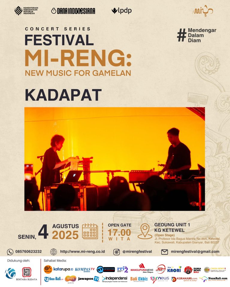 Festival Mi-Reng: New Music for Gamelan kembali hadir dengan menghadirkan musisi eksperimental Bali yang tengah mendapat perhatian luas, KADAPAT. Konser ini akan berlangsung pada Senin, 4 Agustus 2025 di Gedung Unit 1 KG Ketewel (Open Stage), Gianyar, Bali, dengan pintu masuk dibuka pukul 17.00 WITA.